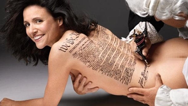 Dizi oyuncusu Julia Louis Dreyfus, Rolling Stone dergisinin Nisan sayısı için ABD Anayasası’nın bir kısmını sırtına dövme yaptırdı.