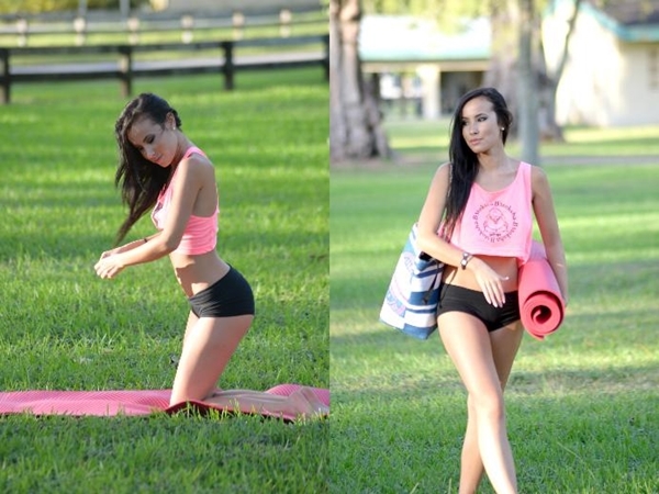 Üzerinde siyah bir şort ve pembe bir tişört bulunan Opie, yoga egzersizleri yaparken görüntülendi.