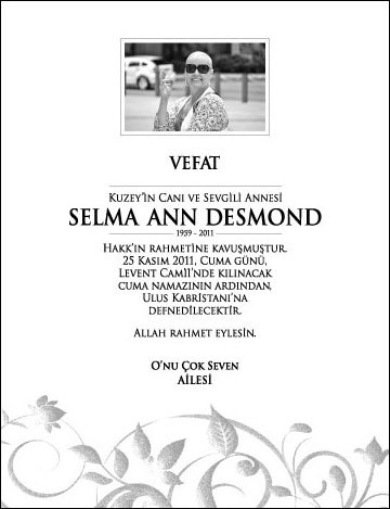 Ali Taran, eski eşi Selma Ann Desmond’un vefatının ardından, ölüm ilanını yayınladı.