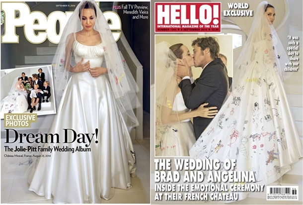Her iki dergi de çiftin Fransa’da gerçekleşen düğününü birer albüm halinde okuyucularına sundu. Böylece herkesin merakla beklediği Angelina Jolie’nin gelinliği de ilk kez görücüye çıktı.