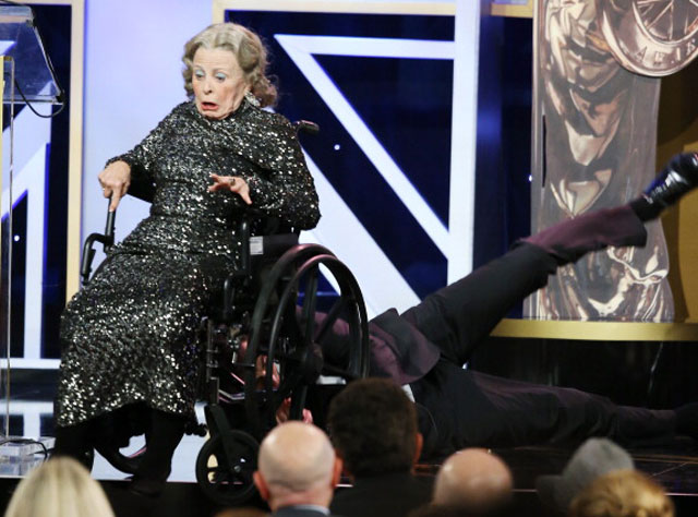 Los Angeles’da düzenlenen gecede, Charlie Chaplin komedi ödülünü almak için sahneye çıkan Sacha Baron Cohen, sahnede duran yaşlı kadını seyircilerin arasına fırlattı.