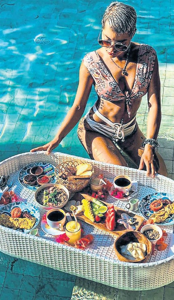Saçlarını kısacık kestirip sarıya boyatan güzel model, Bali’deki lüks bir otelde havuzda kahvaltı keyfi yaptı.