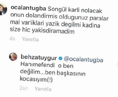 Songül Karlı’nın eski eşi Metin Yüncü’yü Behzat Uygur’a benzeten bir takipçi, “Songül Karlı ne olacak? Onun dolandırmış olduğunuz paraları, mal varlıkları. Yazık değil mi kadına? Size hiç yakıştıramadım” diye yazdı.