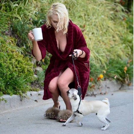 Bordo rengi bornozu, tüylü terlikleri ve elindeki kahve kupasıyla köpeğini gezdirmeye çıkan Courtney Stodden tüm dikkatleri üzerine çekmeyi başardı.