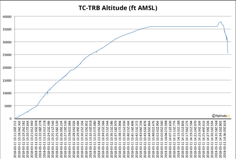 İrtifa bilgilerinde jetin 14.31’de yeniden yükselmeye başladığı görülürken, Uçak 3 dakika boyunca, yani 14.34’e kadar 37 bin feet’e kadar yeniden çıkışa geçiyor.