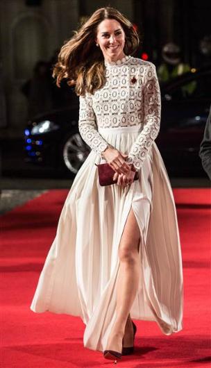 Kıyafetinin derin yırtmacı nedeniyle zaman zaman yürümekte zorlandığı görülen Düşes Kate, geceyi kazasız bir şekilde tamamlandı.