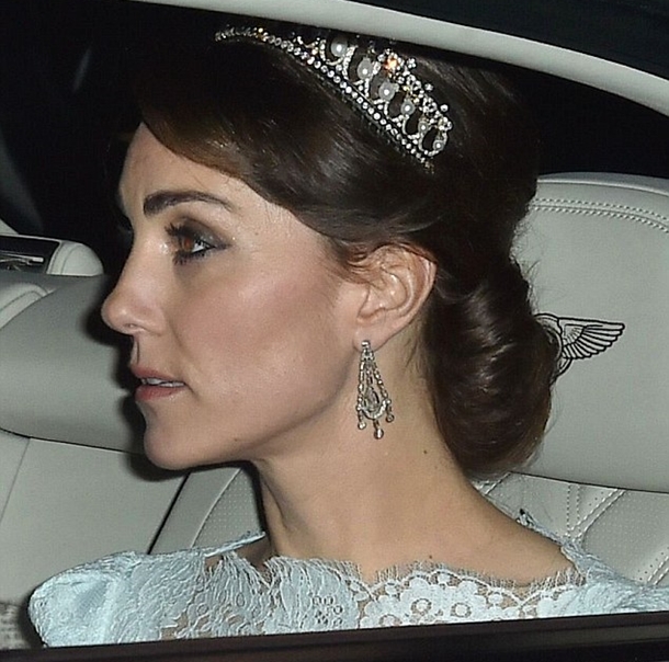 Düşes Kate, önceki gece Kraliçe Elizabeth’in düzenlediği geleneksel resepsiyona giderken giydiği kıyafeti Prenses Diana’nın en sevdiği taçla tamamladı.