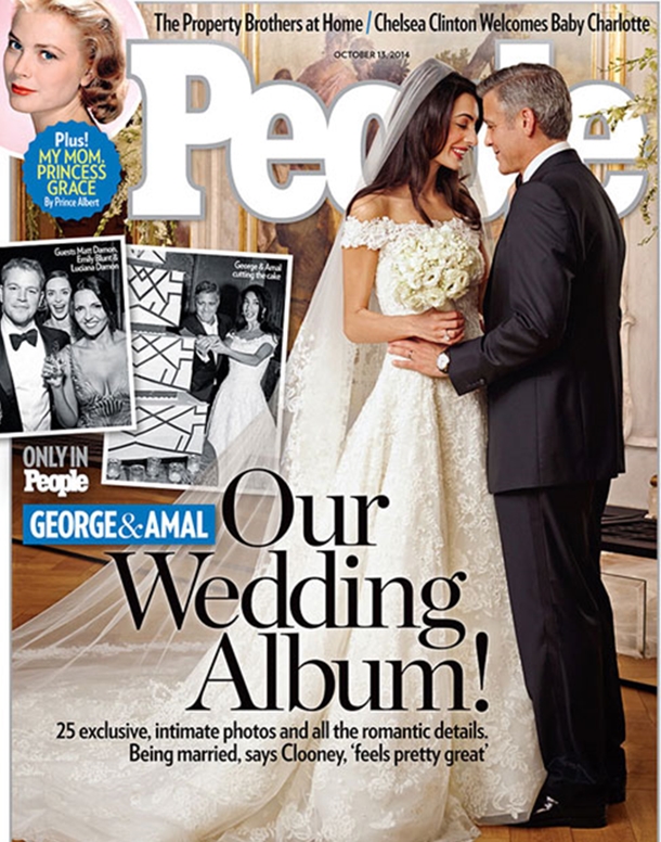 Düğünde George Clooney’nin Giorgio Armani imzalı bir takım, Alamuddin ise, Cambridge düşesi Kate’in de gelinliğini hazırlayan Sarah Burton imzalı Alexander McQueen bir gelinlik giymişti. Düğüne dair ilk fotoğraf People dergisinde yayınlandı.