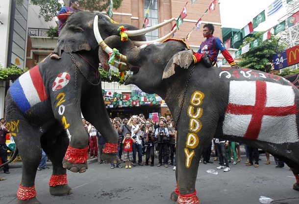 Bangkok’ta ise Dünya Kupası heyecanı filler üzerinde yürüyor. Fransa, İngiltere, Brezilya gibi ülke takımlarının bayraklarıyla boyanan filler 100’lerce kişinin önünde bir performans sergiledi.