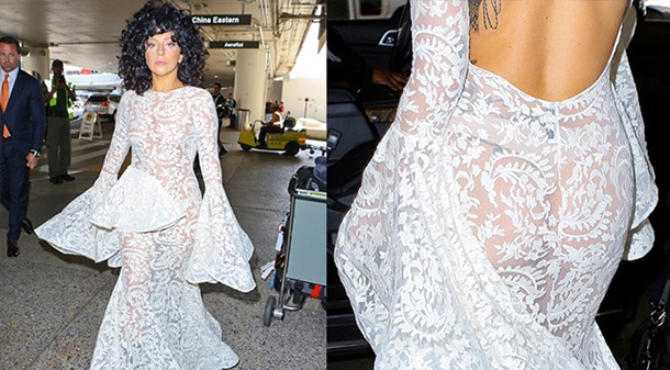 ArtPOP turnesinde verdiği konser sonrası havaalanında görüntülenen Lady Gaga, transparan elbisenin altına sadece tanga giydi.