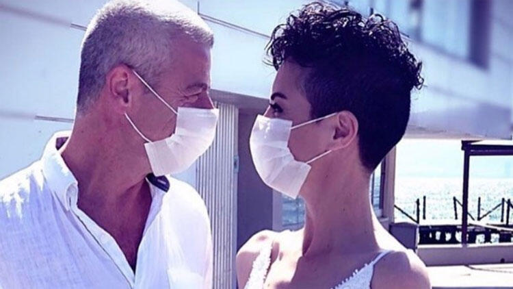 Çift, İzmir’de gerçekleşen nikah sonrası yüzlerinde maskelerle bu pozu verdi.