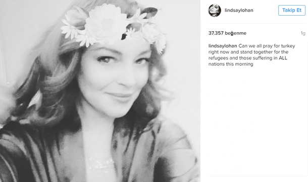 Lindsay Lohan instagram sayfasına yüklediği fotoğrafın altına “hemen şimdi Türkiye için dua edebilir miyiz? Ve bu sabah yine hepimiz, müttefik ülkelerde sıkıntı çeken mülteciler için ayağa kalkabilir miyiz?” notunu düştü.