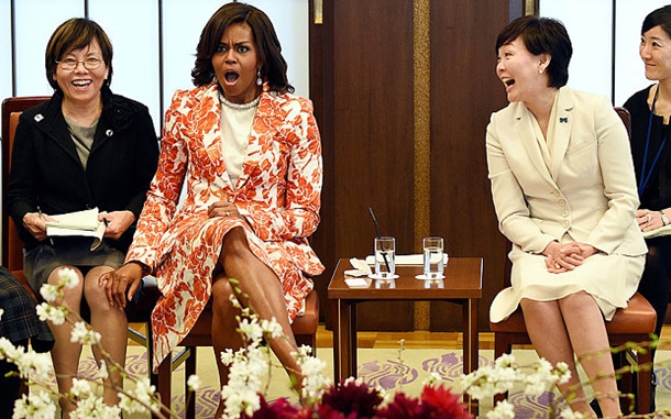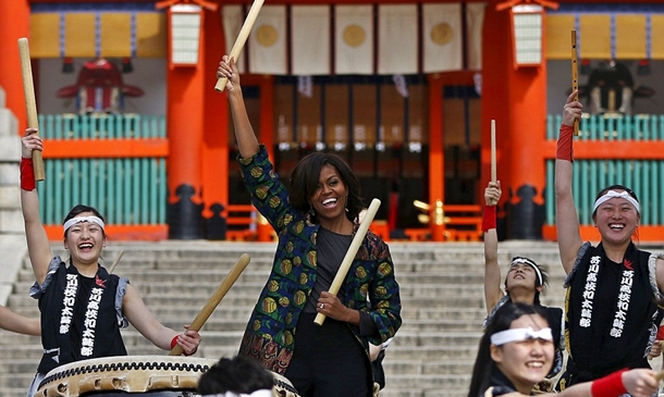 First Lady, 18 Mart’ta başlayan ve üç gün süren Japonya ziyaretinde, Tokyo’da bulunan ünlü budist tapınaklarını gezip, üniversiteli kız öğrencilerle bir araya geldi. Japonya Kraliyet Ailesi ile de bir araya gelen Obama, ziyaretler sırasında giydiği, açık tonların hakim olduğu kıyafetleriyle dikkat çekti.