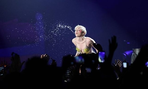 Ağzındaki suyu seyircilere doğru püskürten Cyrus, geçen haftaki konserinde yaptığı gibi eline aldığı bir sutyenle de uzun süre dans etti.