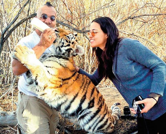 İnsanlarla iç içe büyüyen yavru kaplana ev kedisi muamelesi yapan ikili, çektikleri fotoğrafları sosyal medyada hayranları ile paylaştı.