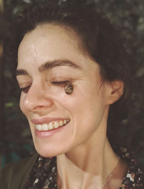 ‘Kadın’ dizisinin başarılı oyuncusu, dizi çekimleri sırasında gördüğü minik salyangozu yüzüne koyarak poz verdi.
