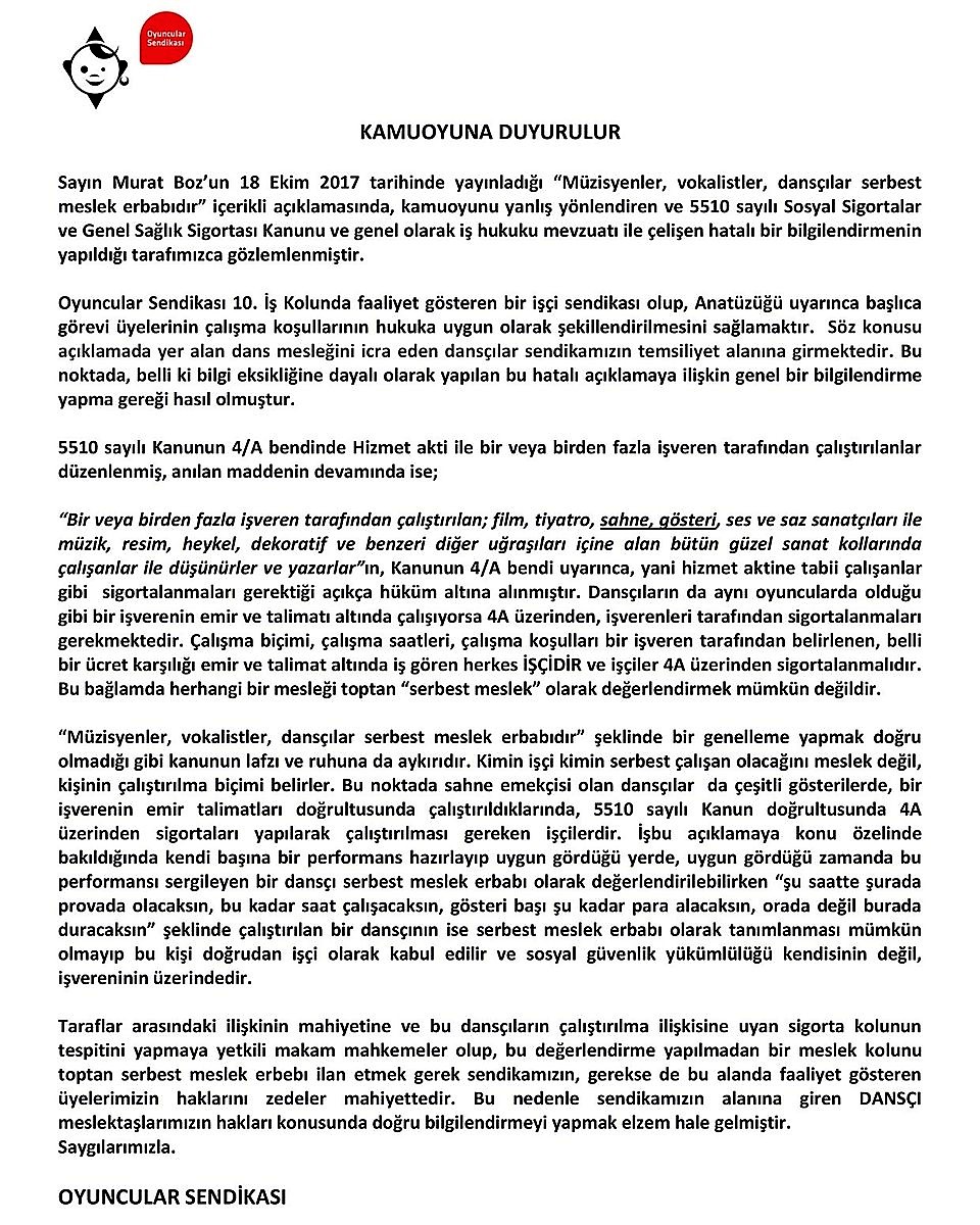 “Müzisyenler, vokalistler, dansçılar serbest meslek erbabıdır. Verdikleri hizmet karşılığı haklarını alır ve sektörde sadece bir kişiyle değil çoğunlukla bir çok kişiye çalışırlar. Dolayısıyla vergilerini ve sigortalarını kendileri ödemelidir.” şeklinde açıklama yapan Boz’a Demet Akbağ’ın başkanı olduğu Oyuncular Sendikası’ndan yanıt gecikmedi.