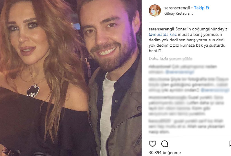 Seren Serengil, Instagram’dan paylaştığı fotoğrafın altına “Soner’in (Şarkıcı Soner Sarıkabadayı) doğum günündeyiz. Murat’a “Barışıyor musun?” dedim. “Yok!” dedi. “Sen barışıyor musun? dedi. “Yok!” dedim. Kurnaza bak ya, susturdu beni” notunu düştü.