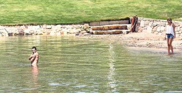 Kenan İmirzalıoğlu denizin soğuk olmasına aldırış etmeden bol bol yüzerken eşi Sinem Kobal ise kıyında onu izlemekle yetindi.