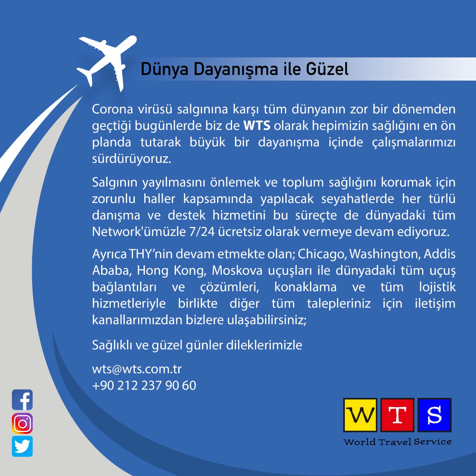 Ünlü turizm şirketi World Travel Service’den corona virüsü nedeniyle zor günler geçiren ülkemiz için dayanışma mesajı geldi.