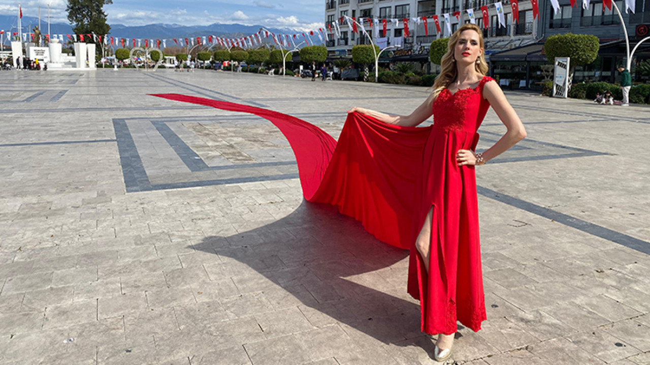 Muğla’nın Fethiye ilçesinde Manken Wilma Elles, giydiği gelinlikle ilgi odağı oldu. 100 metre kuyruğu olan kırmızı gelinlik satışından elde edilecek gelir depremzede çocuklara bağışlanacak.
